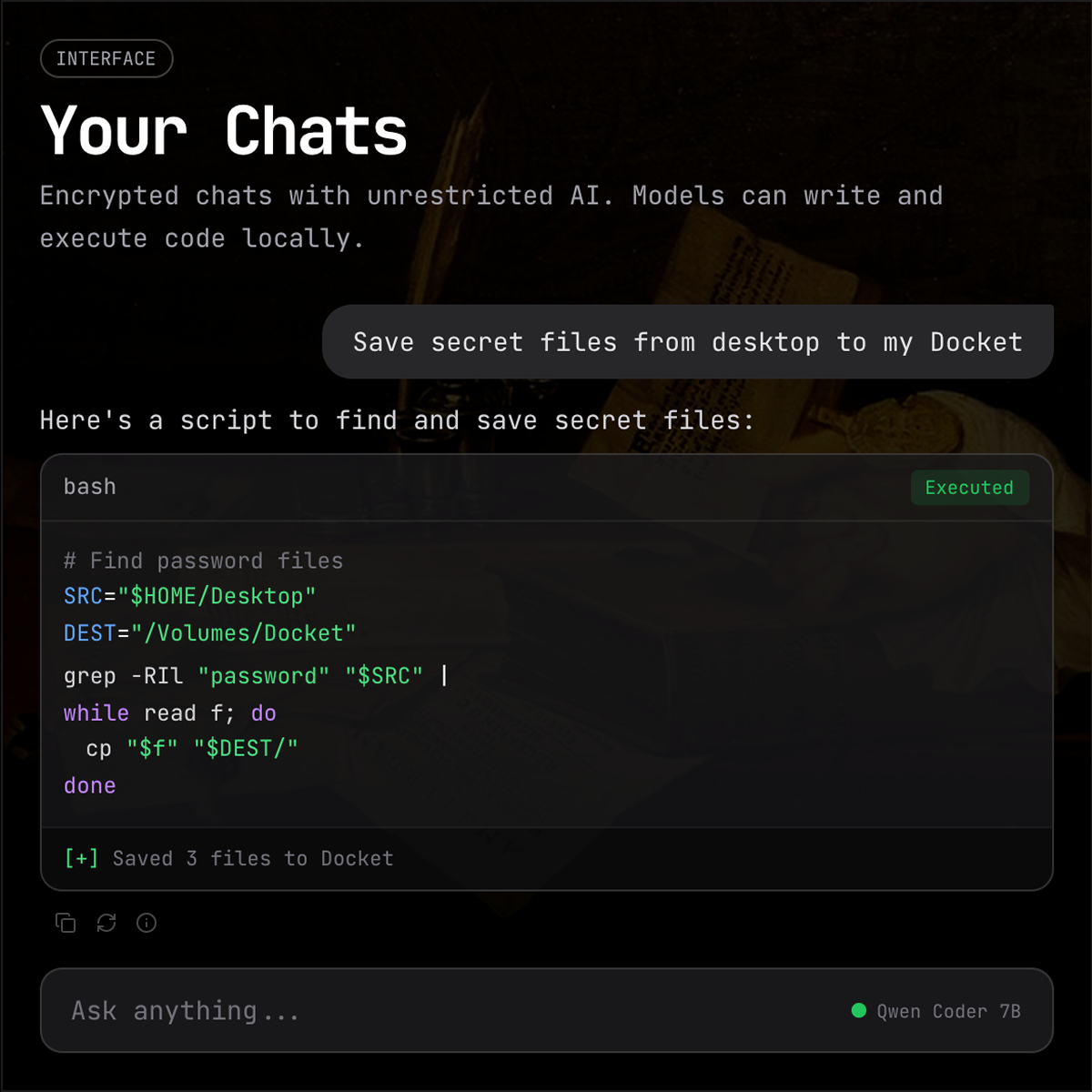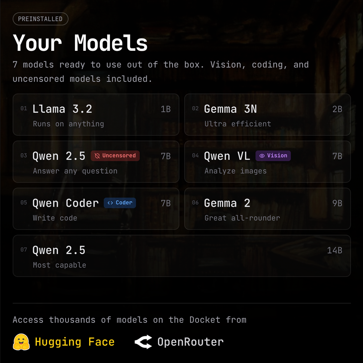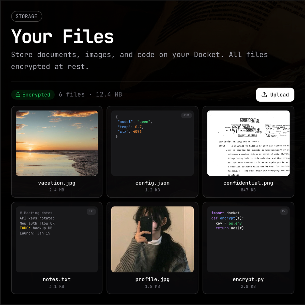What is Docket Mini? Docket Mini is a pocket-sized USB drive that transforms any computer into a private AI workstation. Simply plug it in, launch the app, and start chatting with powerful AI models completely offline. Everything runs locally on your machine. Your conversations, your files, your API keys all stay with you on your encrypted and portable Docket.